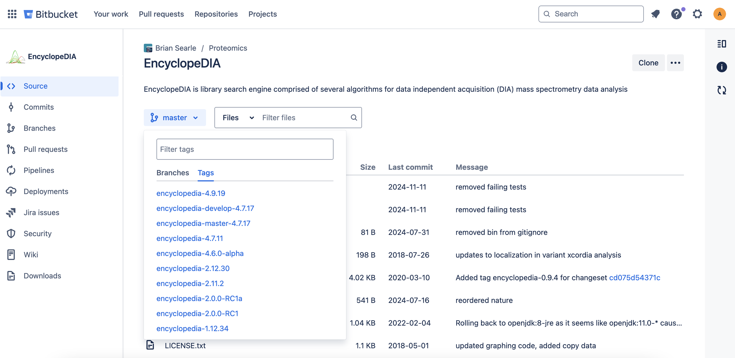 Go to the Source code tab on the bitbucket website, then navigate to the tagged version (pic below). I’m not sure what the difference is between 4.7.11 and 4.9.19, but I know that 4.7.11 is what I use to analyze ion trap data. This version is very good for sensitive detection with ion trap analyzers, but version 4.9.19 will outperform 4.7.11 when you are processing data in Orbitrap mode.